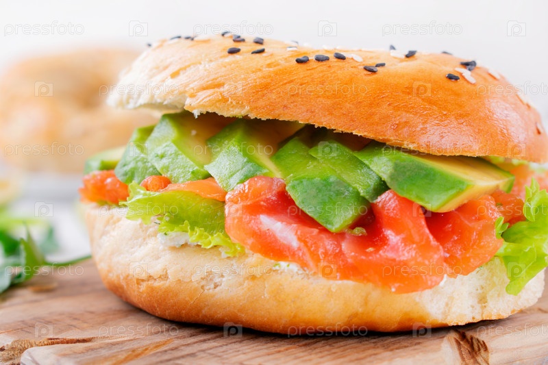 Бублик с соленой форелью, авокадо, листьями салата и сливочным сыром на деревянной доске. Многослойный сэндвич