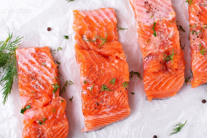 Стейки из сырой форели, приправленные соком лайма, солью и перцем, на пергаментной бумаге. Приготовление красной рыбы. Вид сверху
