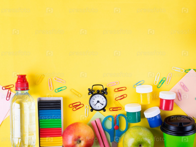 Обратно в школу лежала квартира. Набор канцелярских принадлежностей, яблоки, бутылка с водой, бумажный стаканчик и будильник на желтом фоне. Красочная композиция с копией пространства