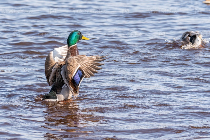 Утки на воде весной. Дикая утка отражается в воде. Красочные птичьи перья. Пруд с утками и селезнями. Утки кормятся на поверхности воды