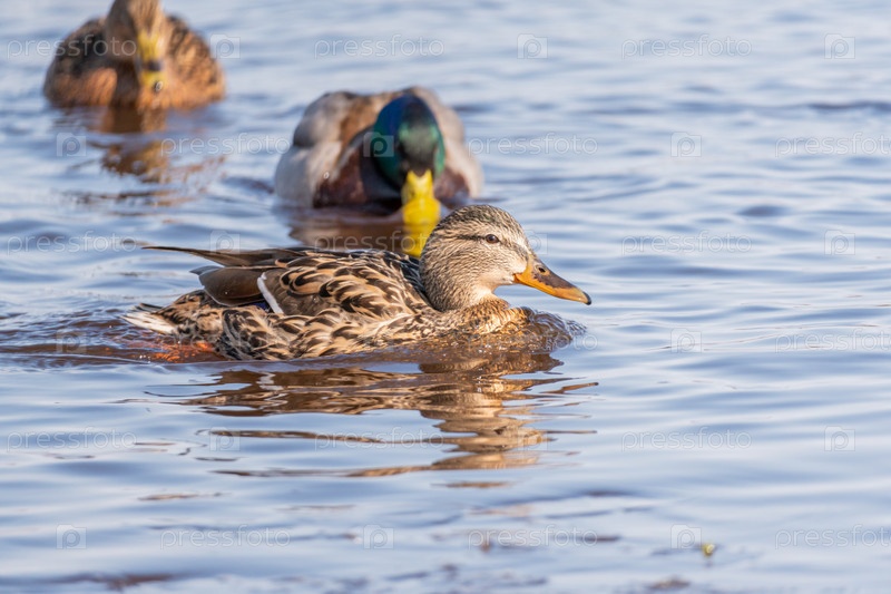 Уток на воде весной. Дикая утка отражается в воде. Разноцветные птичьи перья. Пруд с утками и селезнями. Утки кормятся на поверхности воды