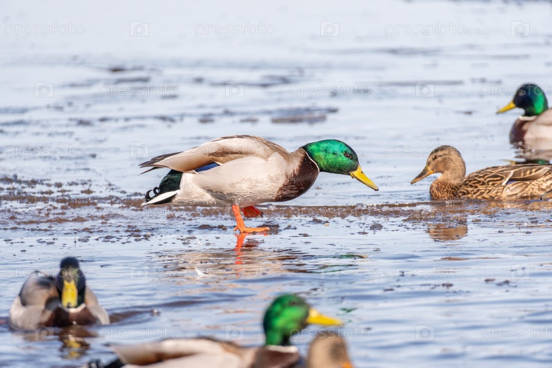 Утки на воде весной. Дикая утка отражается в воде. Красочные птичьи перья. Пруд с утками и селезнями. Утки кормятся на поверхности воды
