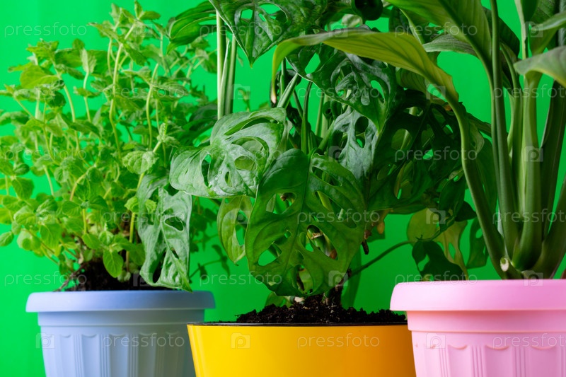 Три комнатных растения в разноцветных горшках. Маска обезьяны Монстера, спатифиллум и мятные растения на зеленом фоне