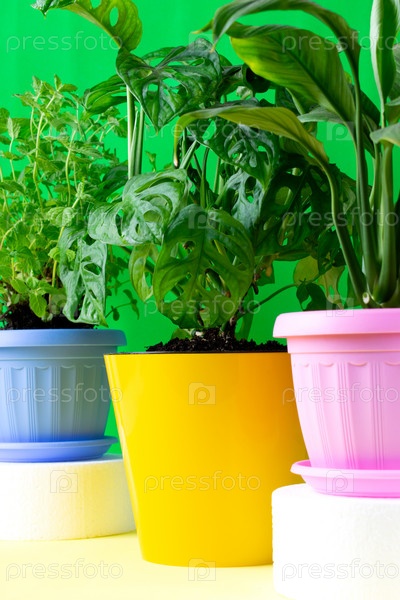 Три комнатных растения в разноцветных горшках. Маска обезьяны Монстера, спатифиллум и мятные растения на зеленом фоне
