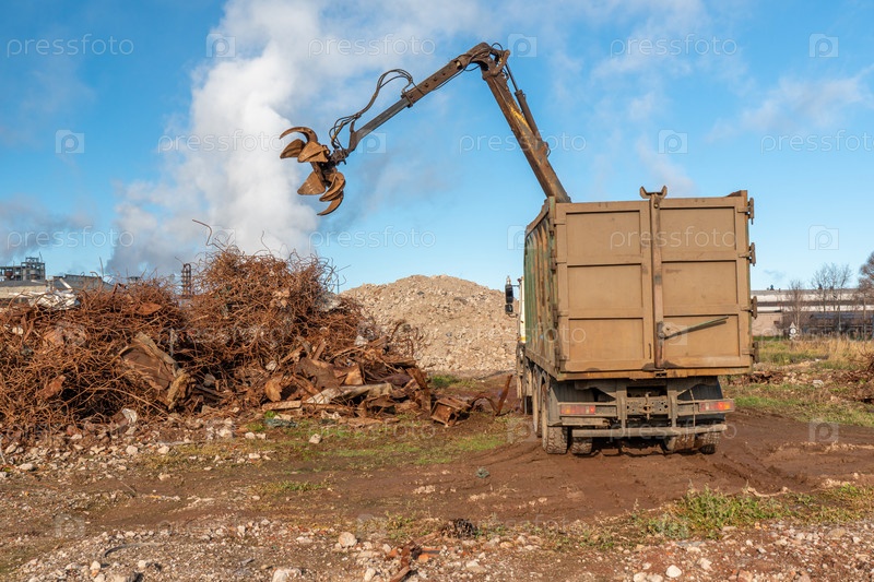 Грейферный грузовик загружает лом промышленного металла для переработки. Манипулятор с гидравлическим магнитным крабом против неба. Кран мусоровоз погрузка отходов промышленности