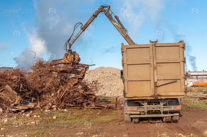Грейферный грузовик загружает лом промышленного металла для переработки. Манипулятор с гидравлическим магнитным крабом против неба. Кран мусоровоз погрузка отходов промышленности
