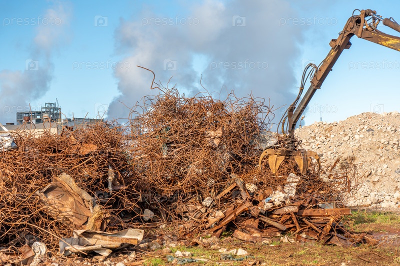 Грейферный грузовик загружает лом промышленного металла для переработки. Манипулятор с гидравлическим магнитным крабом против неба. Кран мусоровоз погрузка отходов промышленности
