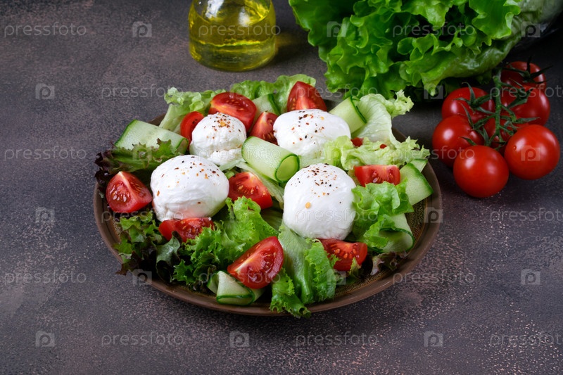 Салат с сыром моцарелла, салатом, огурцом и помидорами со специями и оливковым маслом на коричневой тарелке