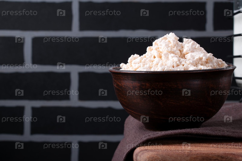 Творог в глиняной миске на краю стола у стены из черного кирпича. Домашний фермерский молочный продукт