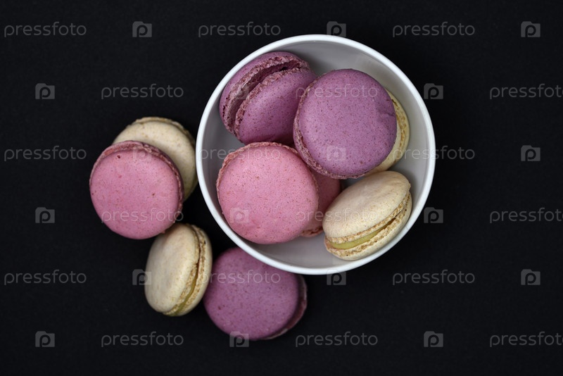 Миндальное печенье в белой тарелке на черном фоне. Миндальное печенье в керамической миске. Красочное сладкое печенье