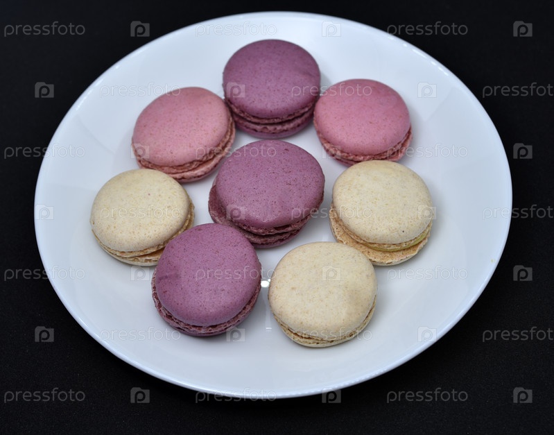 Миндальное печенье в белой тарелке на черном фоне. Красочное сладкое печенье