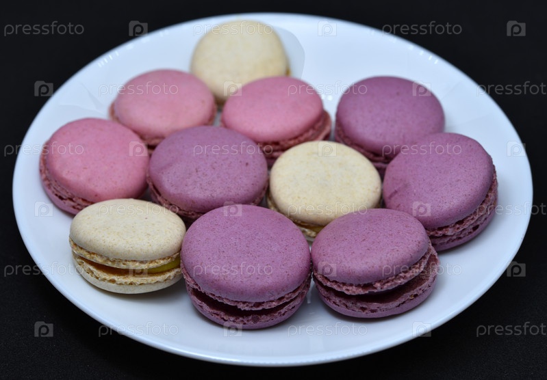 Миндальное печенье в белой тарелке на черном фоне. Красочное сладкое печенье