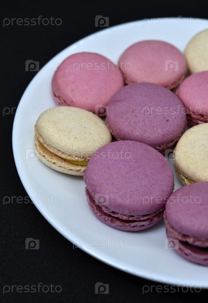 Миндальное печенье в белой тарелке на черном фоне. Красочное сладкое печенье