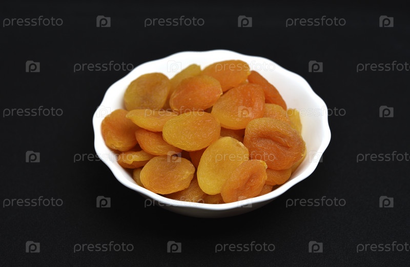 Сочная курага в белой керамической миске. Половинки сушеных абрикосов без косточки