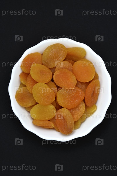 Сочная курага в белой керамической миске. Половинки сушеных абрикосов без косточки