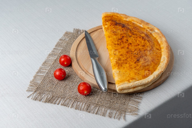 Итальянская кухня. Испанская пицца с сыром сулугуни и помидорами. Сервировка блюд в ресторане на деревянной доске. фоновое изображение, копировать текст