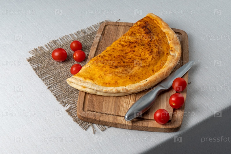 Итальянская кухня. Испанская пицца с сыром сулугуни и помидорами. Сервировка блюд в ресторане на деревянной доске. фоновое изображение, копировать текст