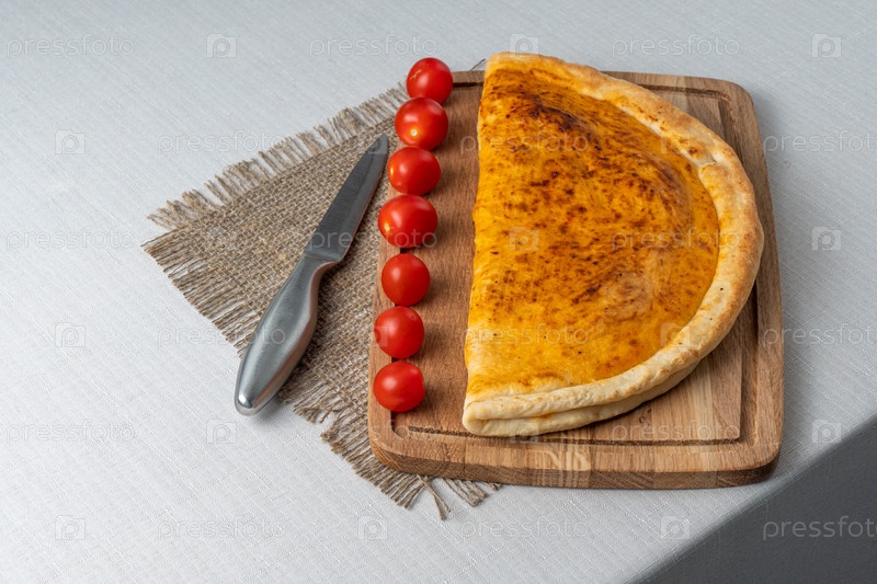 Итальянская кухня. Испанская пицца с сыром сулугуни и помидорами. Сервировка блюд в ресторане на деревянной доске. фоновое изображение, копировать текст