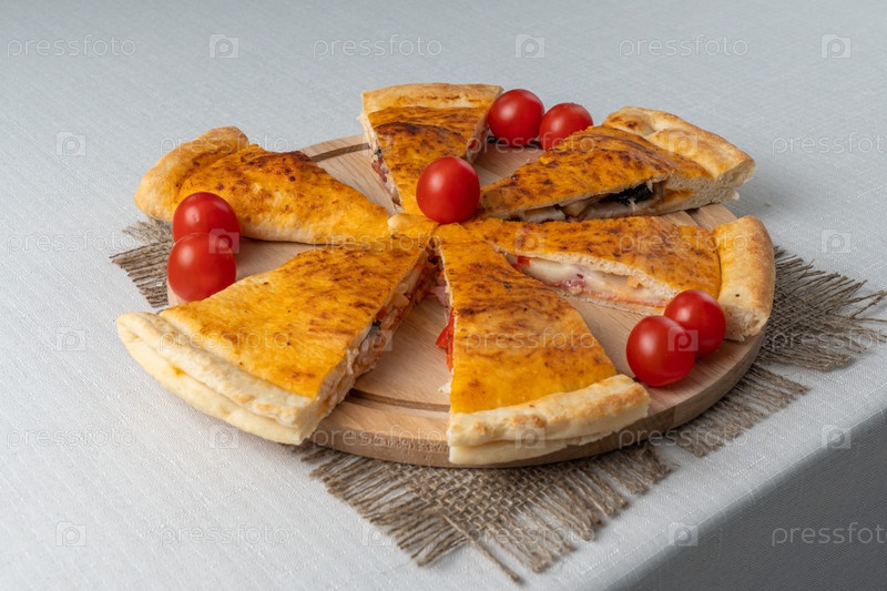 Итальянская кухня. Испанская пицца с сыром сулугуни и помидорами. Сервировка блюд в ресторане на деревянной доске. фоновое изображение, копировать текст
