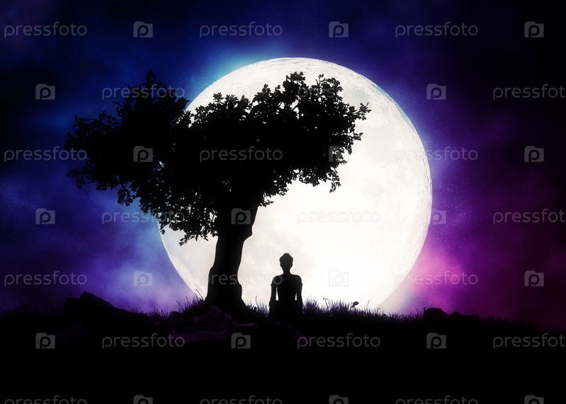 Девушка под силуэтом дерева и полнолунием