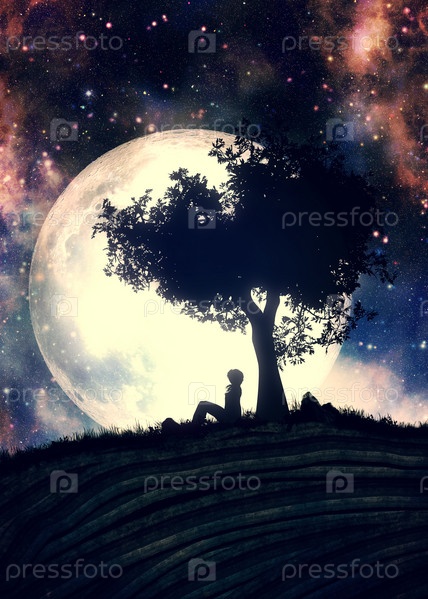 Девушка под силуэтом дерева и полнолунием
