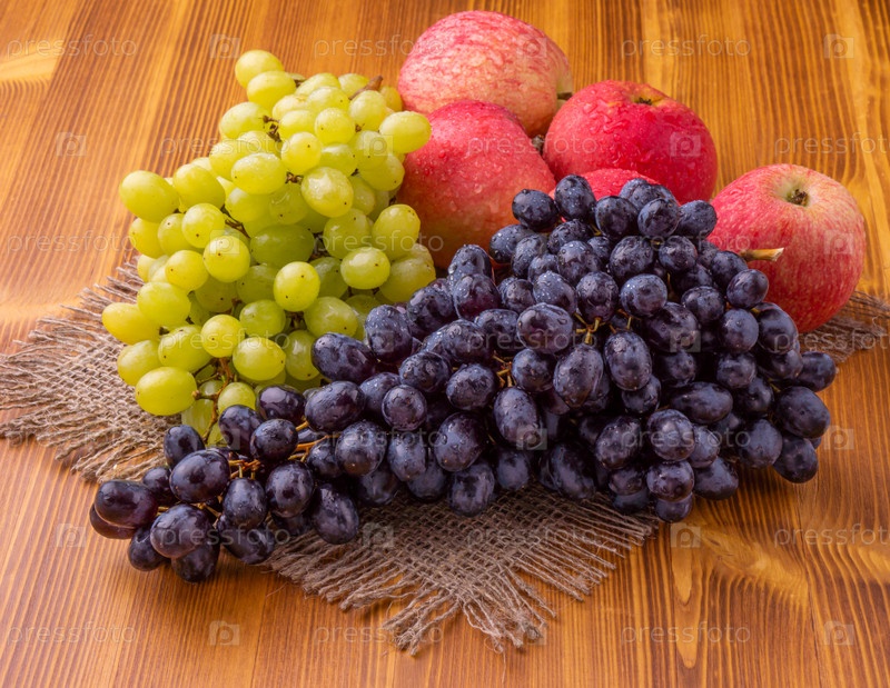 Разный виноград и яблоки на деревянном фоне. Здоровая пища