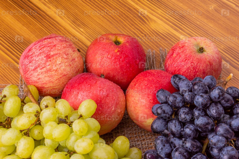 Различные виноград и яблоки на деревянном фоне. Здоровая пища