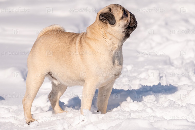 Мопс смотрит в камеру. Крупный план мопса в снегу