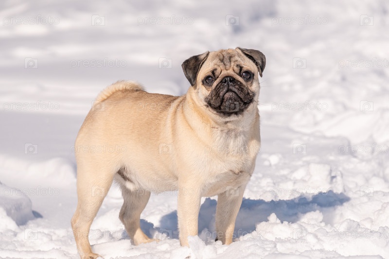 Собака породы мопс смотрит в камеру. Крупный план мопса на снегу