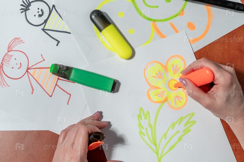 Женские ухоженные руки рисуют фломастерами на белом листе. За партой. Вид сверху