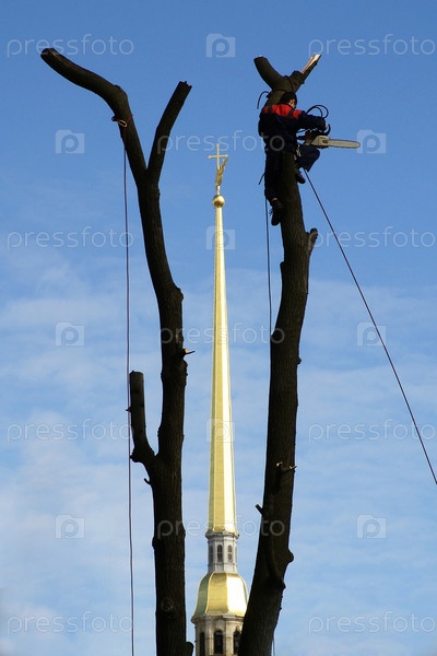 Россия.Санкт-Петербург.Рабочий коммунального хозяйства спилирует вершины деревьев на фоне Петропавловской крепости.Россия.Санкт-Петербург.Работник коммунальной службы вырубает вершины деревьев на фоне Крепости Петра и Павла