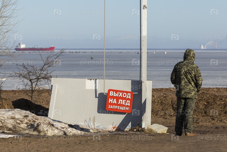Россия. Санкт-Петербург. Виды на Финский залив. Надпись 'Выход на лед запрещен'. Россия. Санкт-Петербург. Виды на Финский залив. Надпись Доступ к льду запрещён