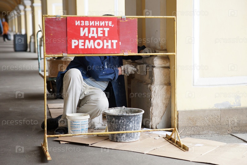 Россия. Санкт-Петербург. Ремонт зданий. Рабочий ремонтирует фасад дома. Россия. Санкт-Петербург. Реконструкция здания. Работник ремонт фасада дома