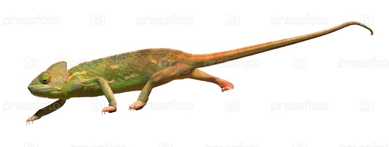 Яркий оранжево-зеленый хамелеон на белом фоне изолирован
