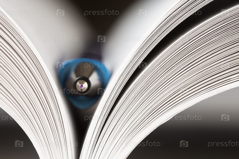Синяя шариковая ручка, встроенная в открытую книгу. Концепция образования, учебы, исследований. Макро с малой глубиной резкости