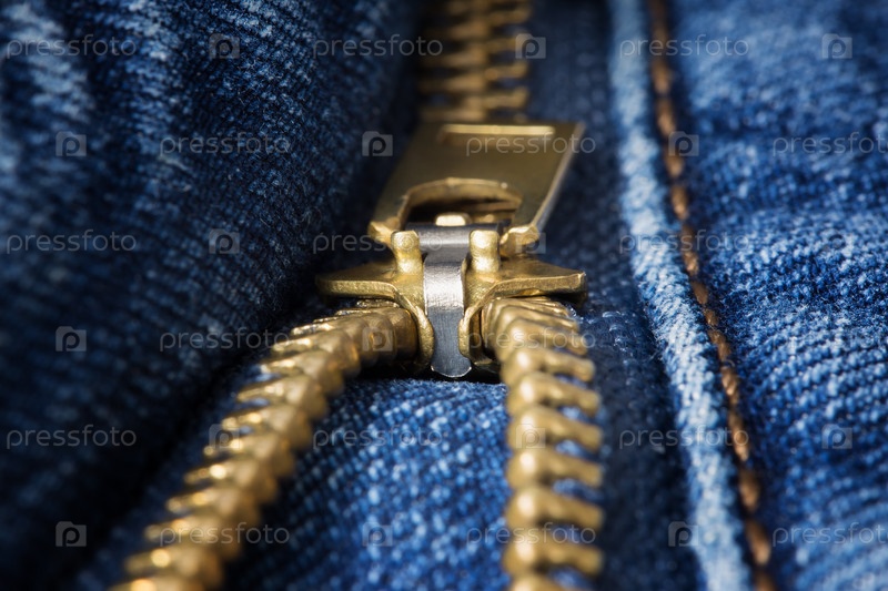 Крупный план расстегнутой латунной молнии на синих джинсах