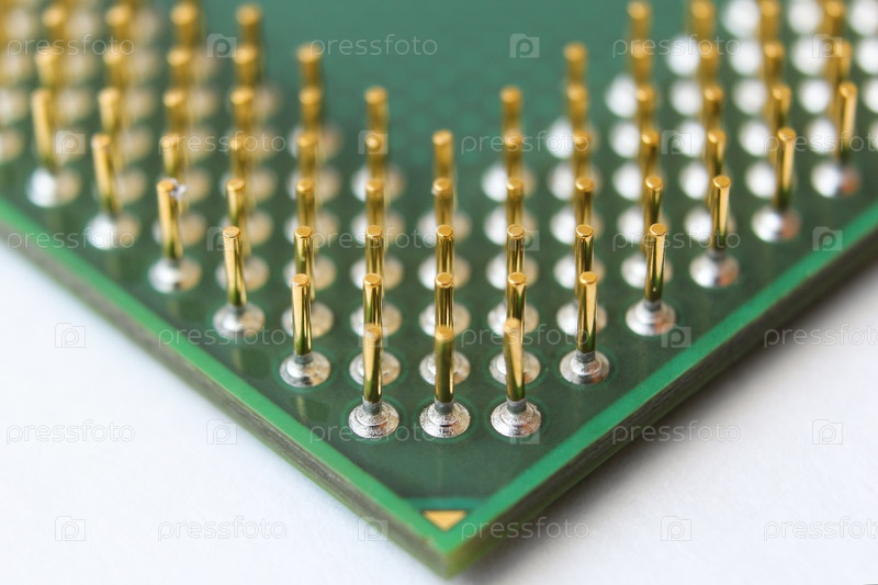 Золотые штифты на процессоре крупным планом