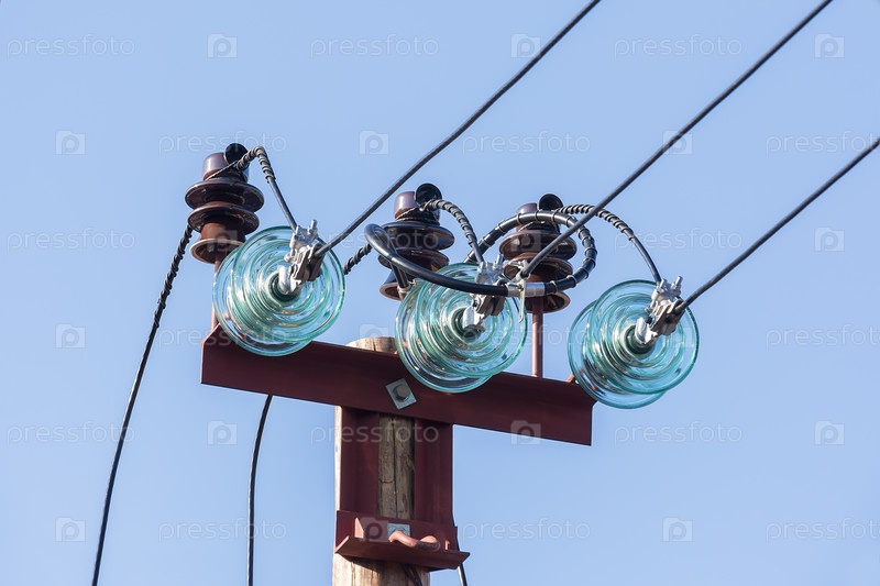 Столб линии электропередач с проводами и изоляторами на фоне голубого неба