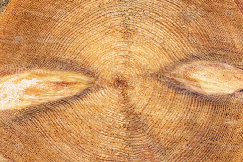 Раздел ствола дерева с годовыми кольцами и двумя узлами крупным планом