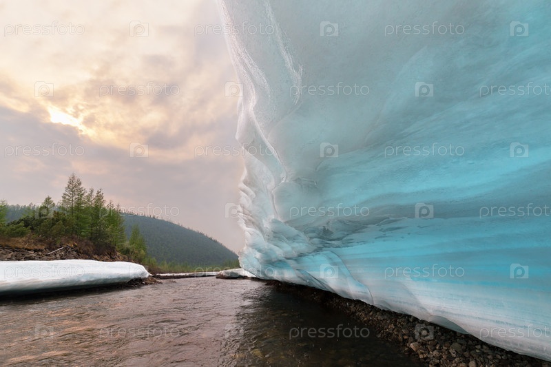 Пейзаж с ледяным телом из бирюзового льда. Вид снизу