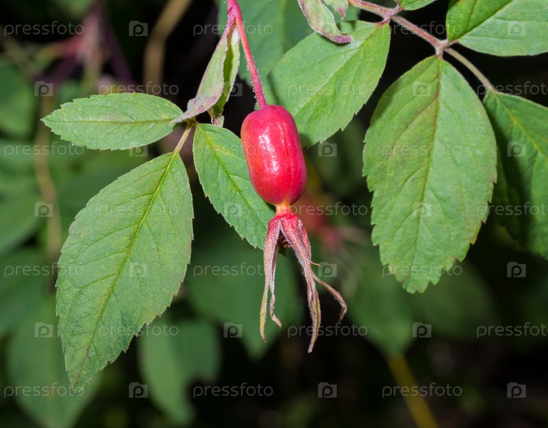 Ягоды шиповника крупным планом на фоне зеленых листьев