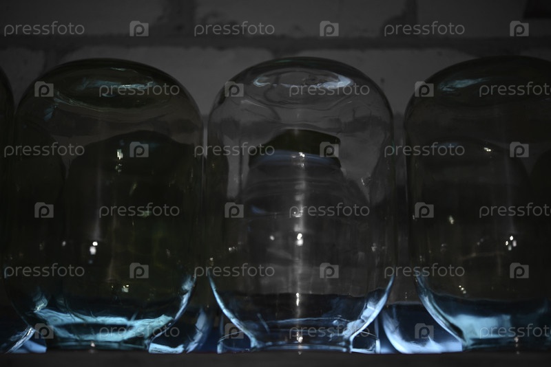 Стеклянные банки стоят в ряд в подвале. Стеклянные контейнеры