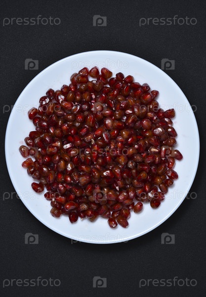Плоды граната на белой тарелке. Зерна плодов граната