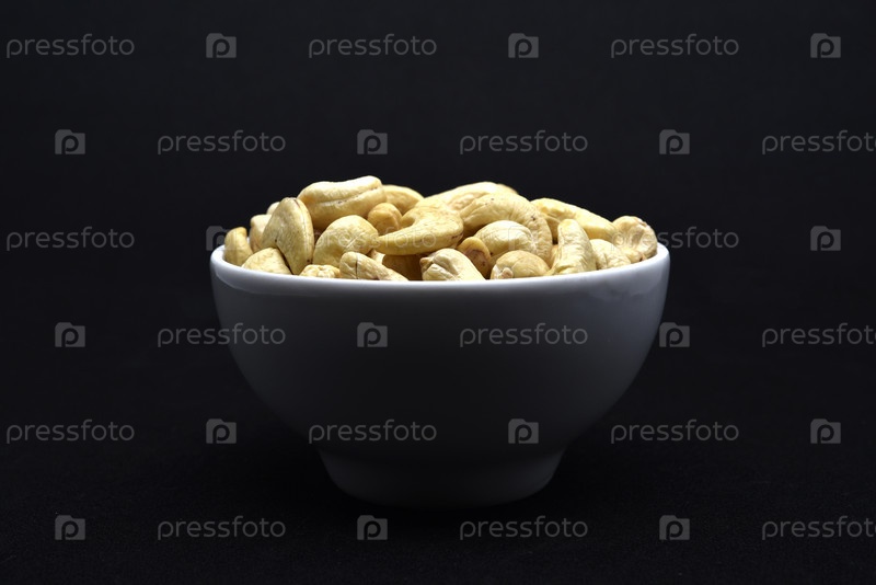 Орехи кешью в белой керамической чашке. Кешью на черном фоне