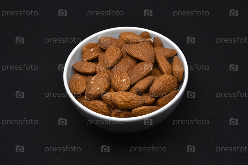 Миндаль в белой керамической миске. Вкусные миндальные орехи крупным планом