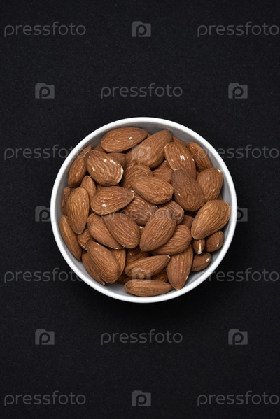 Миндаль в белой керамической миске. Вкусные миндальные орехи крупным планом