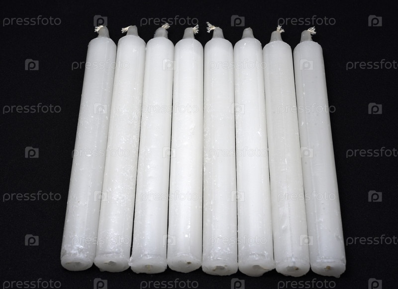 Белые парафиновые свечи на черном фоне. Свечи бытовые в куче