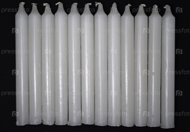 Белые парафиновые свечи на черном фоне. Свечи бытовые в куче