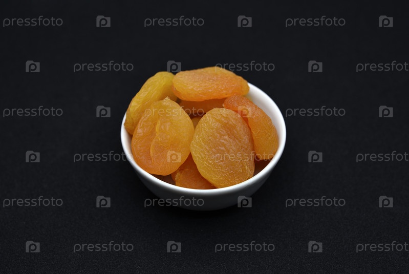 Сушеные персики. Вкусные кураги в керамических мисках на черном фоне