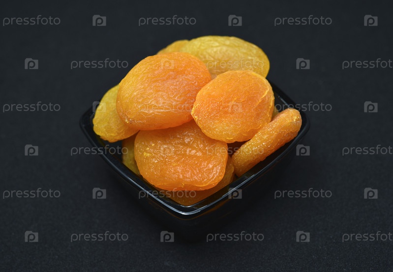 Сушеные персики. Вкусные кураги в стеклянных мисках на черном фоне